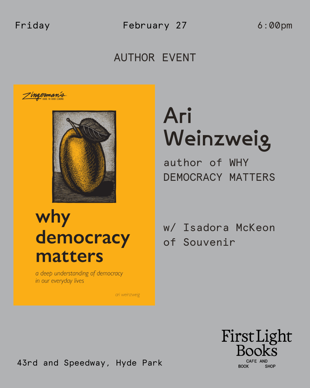 The event will begin with an author reception from 6:30–7 p.m., followed by a conversation and signing.